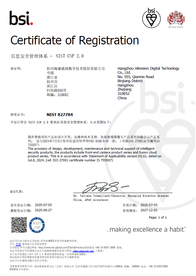 近日,海康威视成功通过NIST CSF网络安全框架2.0版本的认证,经过全球权威标准组织——英国标准协会(BSI)多轮严格审核,成为国内首个获得NIST CSF 2.0认证的公司。这一认证标志着海康威视在网络安全治理、风险管理和合规对标方面达到了国际先进水平。
